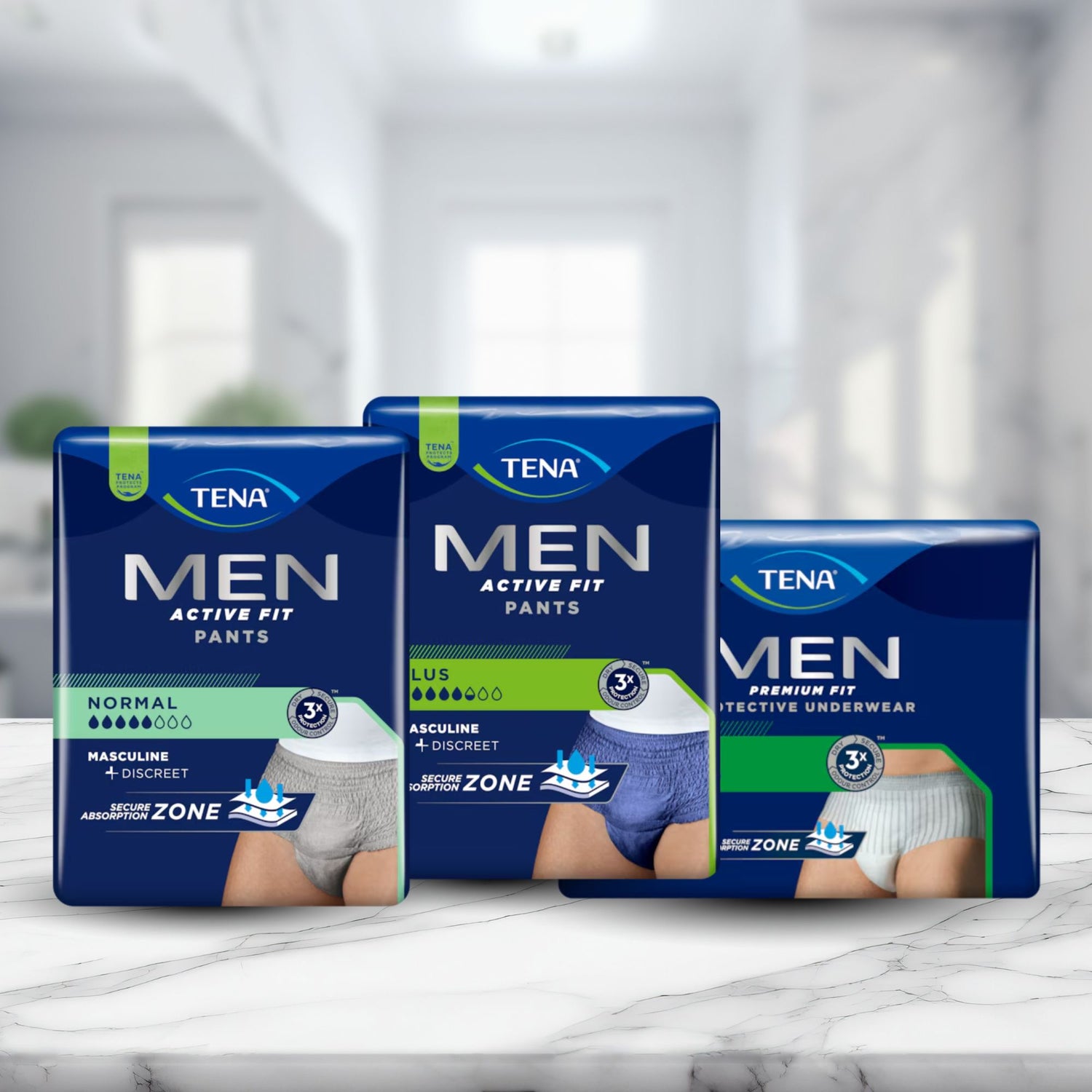 • Eine Packung Muster TENA Men Active Fit Pants Normal Grey von TENA - Essity Germany GmbH mit einem Mann, der das Produkt trägt, wirbt für "diskreten Schutz" für Inkontinenz Männer und ein maskulines, diskretes Aussehen plus sichere Absorptionszone.