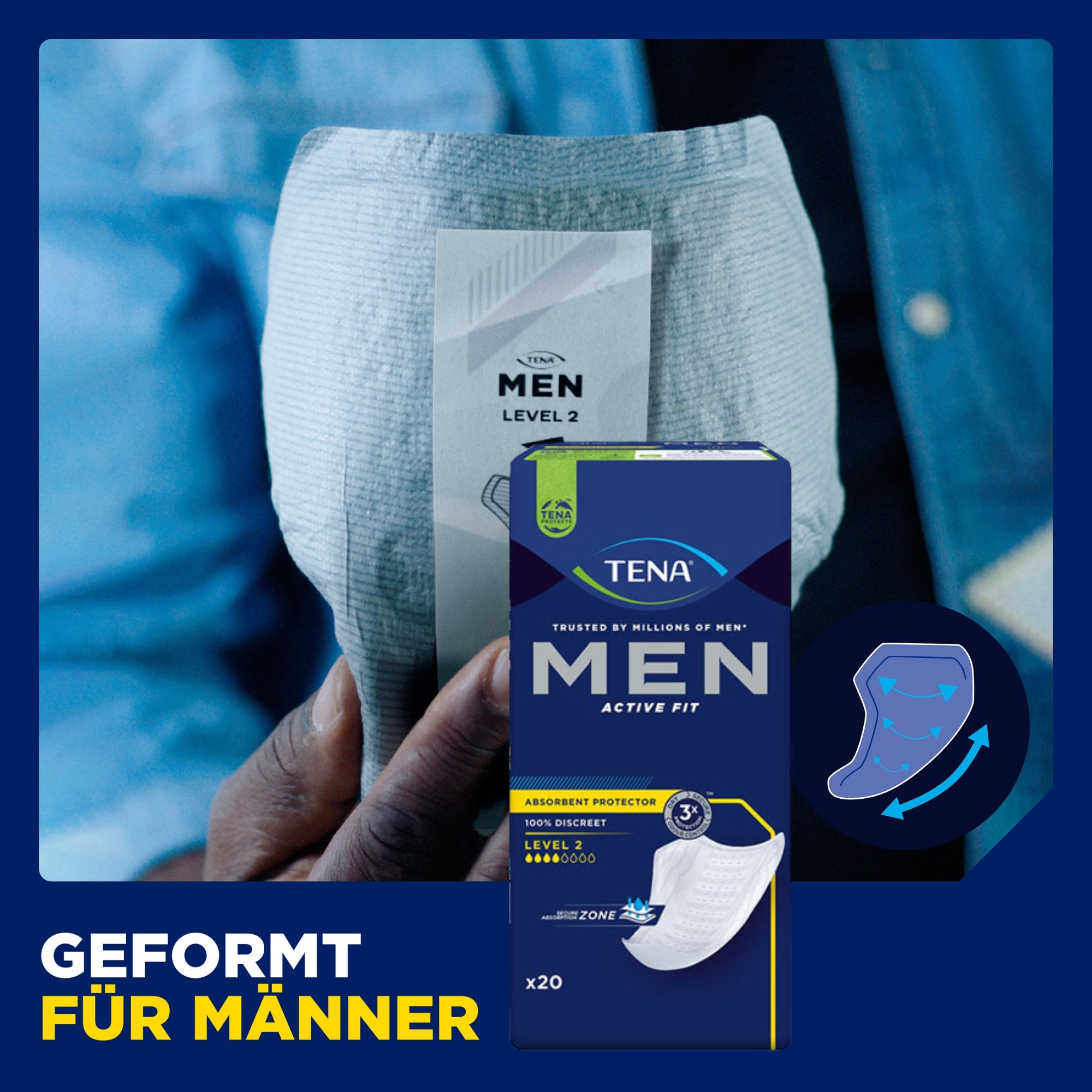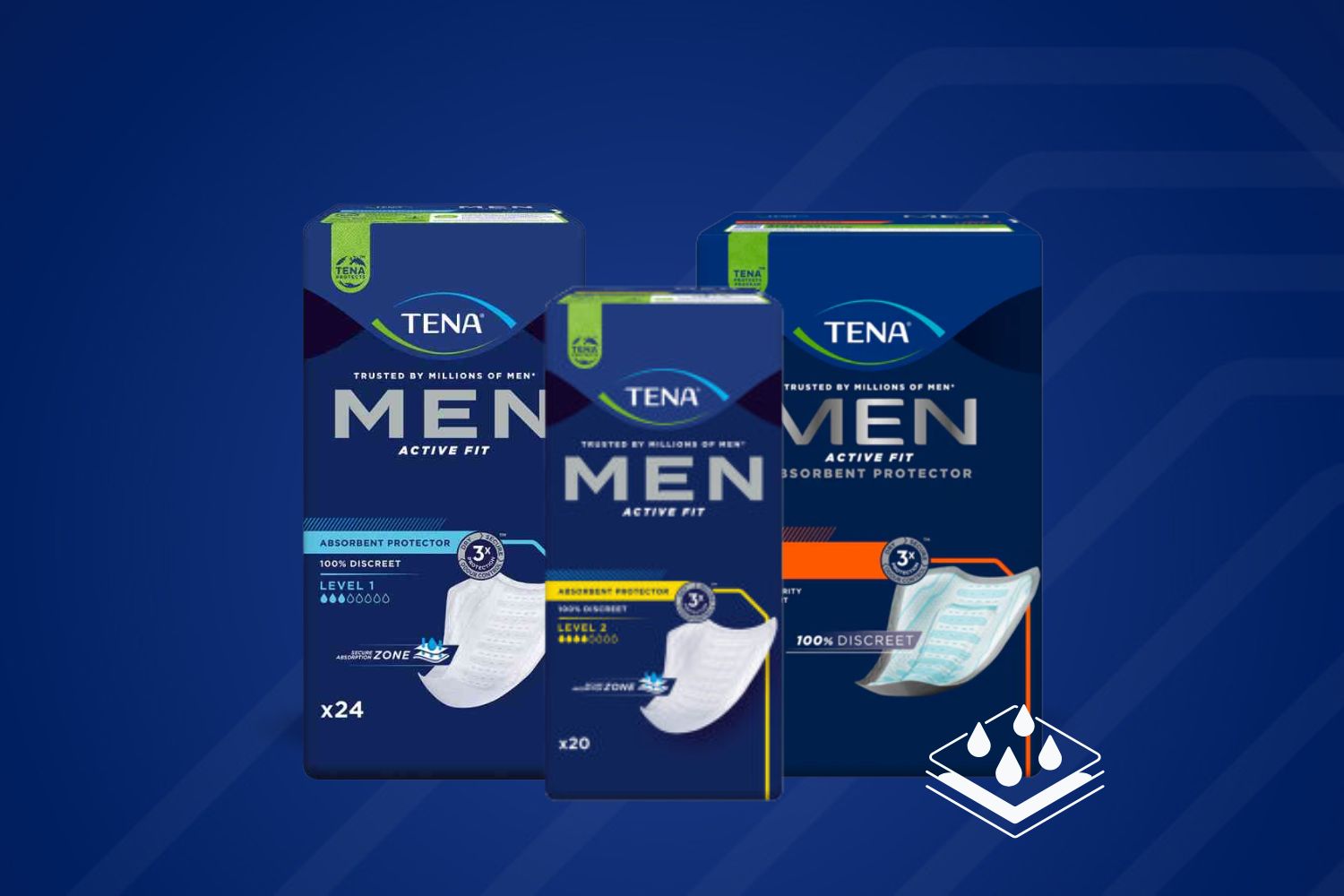 De TENA® Men Active Fit Level 1 inleggers zijn speciaal afgestemd op de mannelijke lichaamsvorm en bieden betrouwbare bescherming bij licht urineverlies, zoals nadruppelen. Dankzij elastische zijpanelen passen de protectoren zich optimaal aan, zitten onopvallend in het ondergoed en zorgen voor hoog draagcomfort.