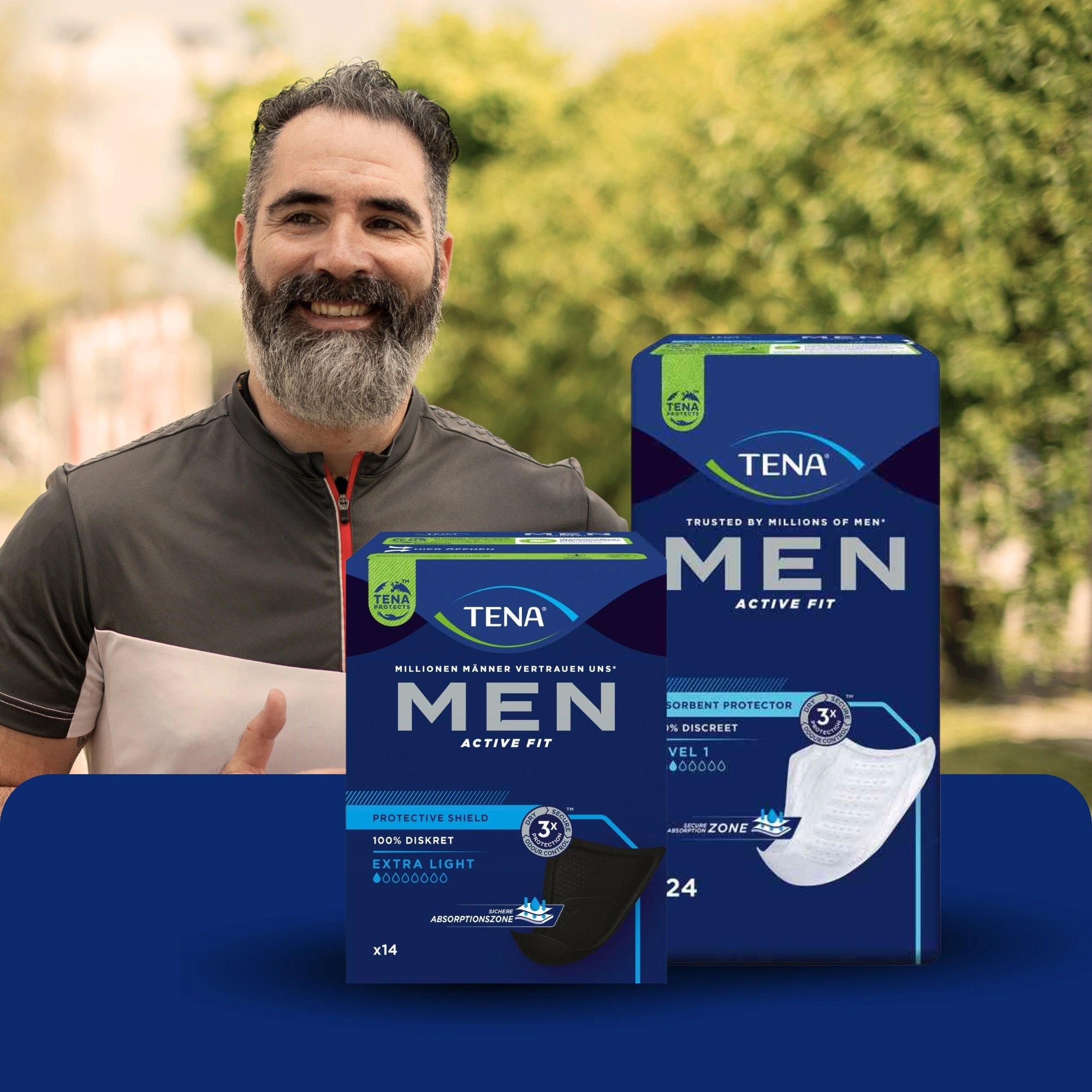 • Een blauwe doos TENA Men Active Protective Shield Extra Light Incontinentieverband (14 stuks) van TENA - Essity Germany GmbH met de opschriften '100% discreet', 'extra licht' en '3x bescherming' in het Duits, evenals productbranding en -afbeeldingen.