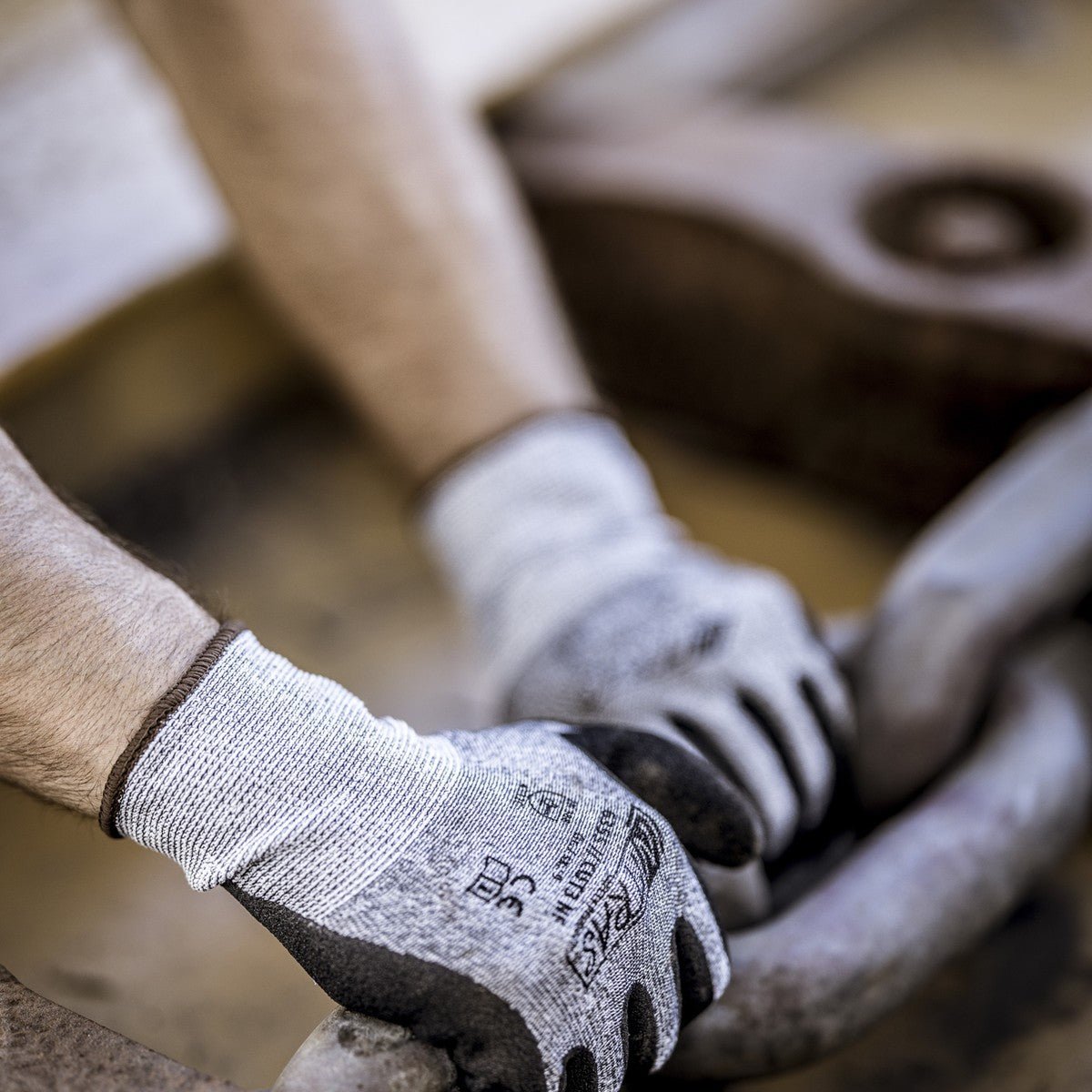 Die NITRAS CUT C NF Schnittschutzhandschuhe sind die perfekte Wahl für alle, die höchste Sicherheit und Tragekomfort in einem Produkt vereint wissen möchten. Gefertigt aus einem hochwertigen Spezialgarn aus HPPE, Polyester und Elasthan, bieten sie einen ausgezeichneten Schnittschutz. Die grauen Handschuhe sind mit einer schwarzen Nitrilschaum-Beschichtung versehen (Farbcode: 1210), die sowohl die Innenhand als auch die Fingerkuppen teilbeschichtet, um einen perfekten Grip und eine sehr hohe Abriebfestigkeit zu gewährleisten. Der Strickbund sorgt für einen sicheren Halt, während die Handschuhe durch ihre rutschfeste Oberfläche einen sehr guten Trocken- und Ölgriff bieten. Diese Handschuhe gehören zur PSA-Risikokategorie II, was sie ideal für den professionellen Einsatz macht.